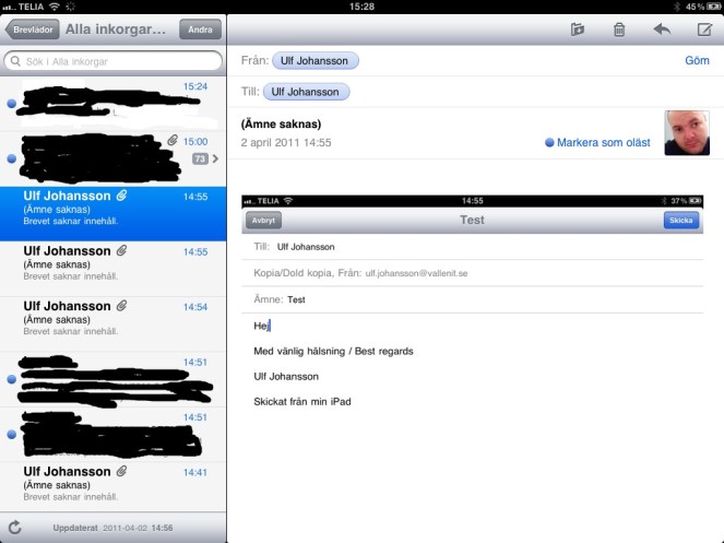 - Stöd för läskvitton. Jag vill få välja om jag vill skicka ett läskvitto på de mail jag skickar. Dessutom skickar iPad automatiskt ett kvitto om mottagaren har begärt det vilket jag också tycker att man bör få välja själv.