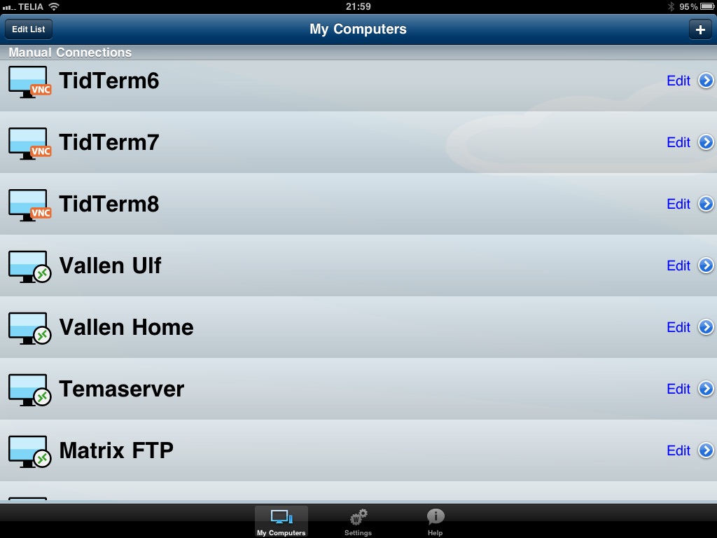Programvarans startskärm innehåller en lista över de datorer som jag har lagt till. Man kan redigera och sortera listan utefter eget huvud och det är enkelt att anpassa varje dator med t.ex adress och inloggningsinformation. För att koppla upp till en dator klickar man bara på den.