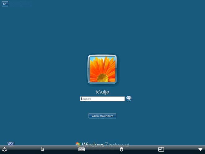 Man kan konfigurera programmet att komma ihåg lösenord för datorerna men jag har av säkerhetsskäl valt att inte spara några lösenord direkt i programmet utan väljer att logga in separat på varje dator. Här ser ni inloggningsskärmen på en av mina Windows 7 datorer på kontoret.