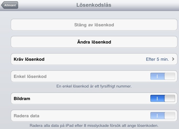 Under inställningarna för själva koden har jag höjt säkerheten ytterligare genom att aktivera radering av all data och inställningar om fel kod anges mer än åtta gånger.