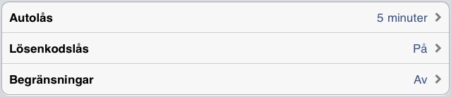 Gå in under inställningar och allmänt så hittar du valen för Lösenkodlås som nån översättningsfreak har lyckats kalla det. Jag har valt att automatiskt låsa efter 5 minuter men man kan välja några olika tider eller direktaktivera.