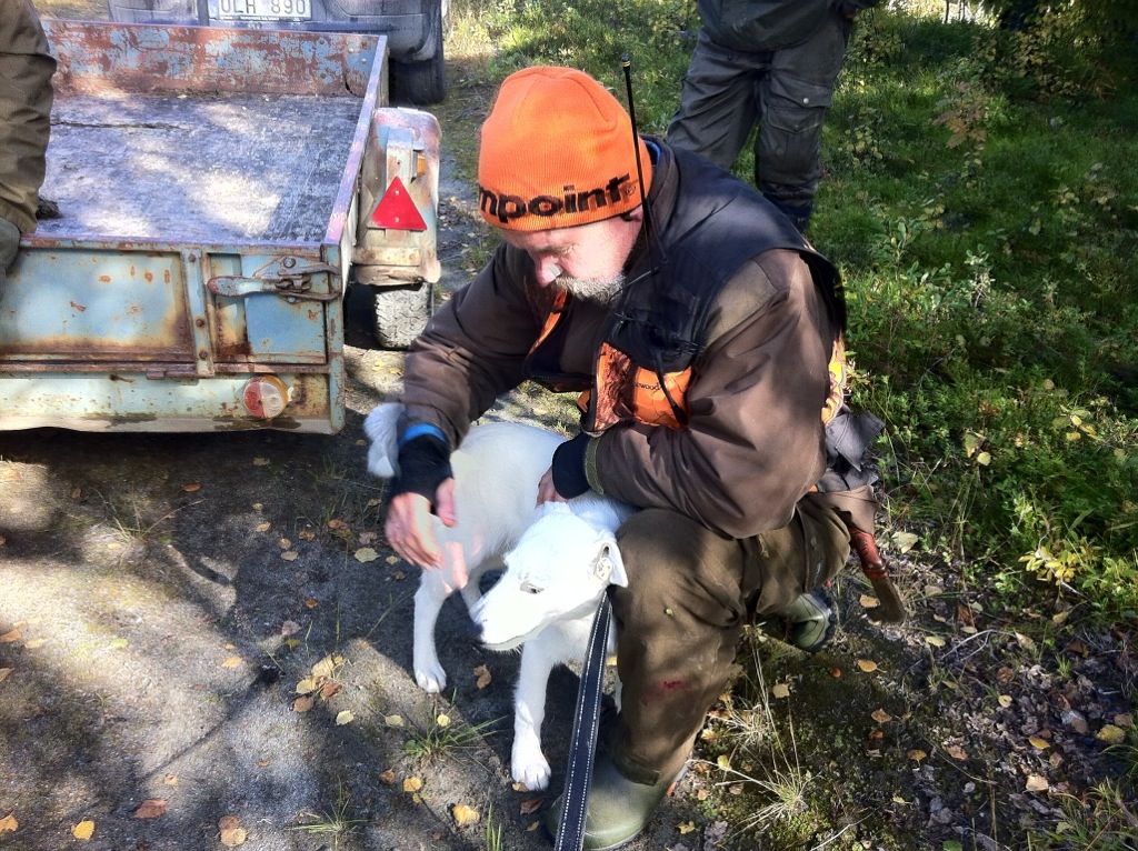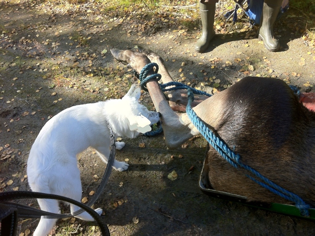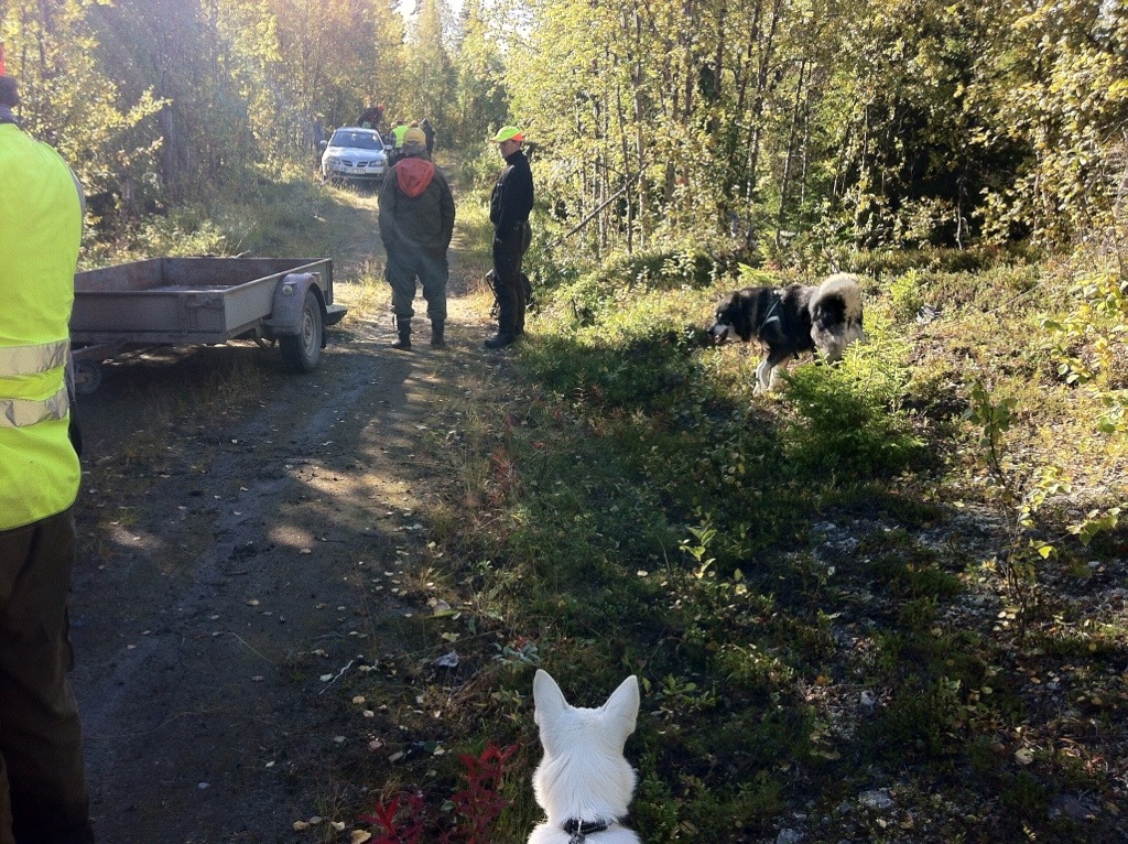 Mikko som bara är fem månader tyckte att det var ett spännande möte med älgen. Mikko är en vit älghund som kanske nästa år är redo att följa husse i skogen på riktigt.