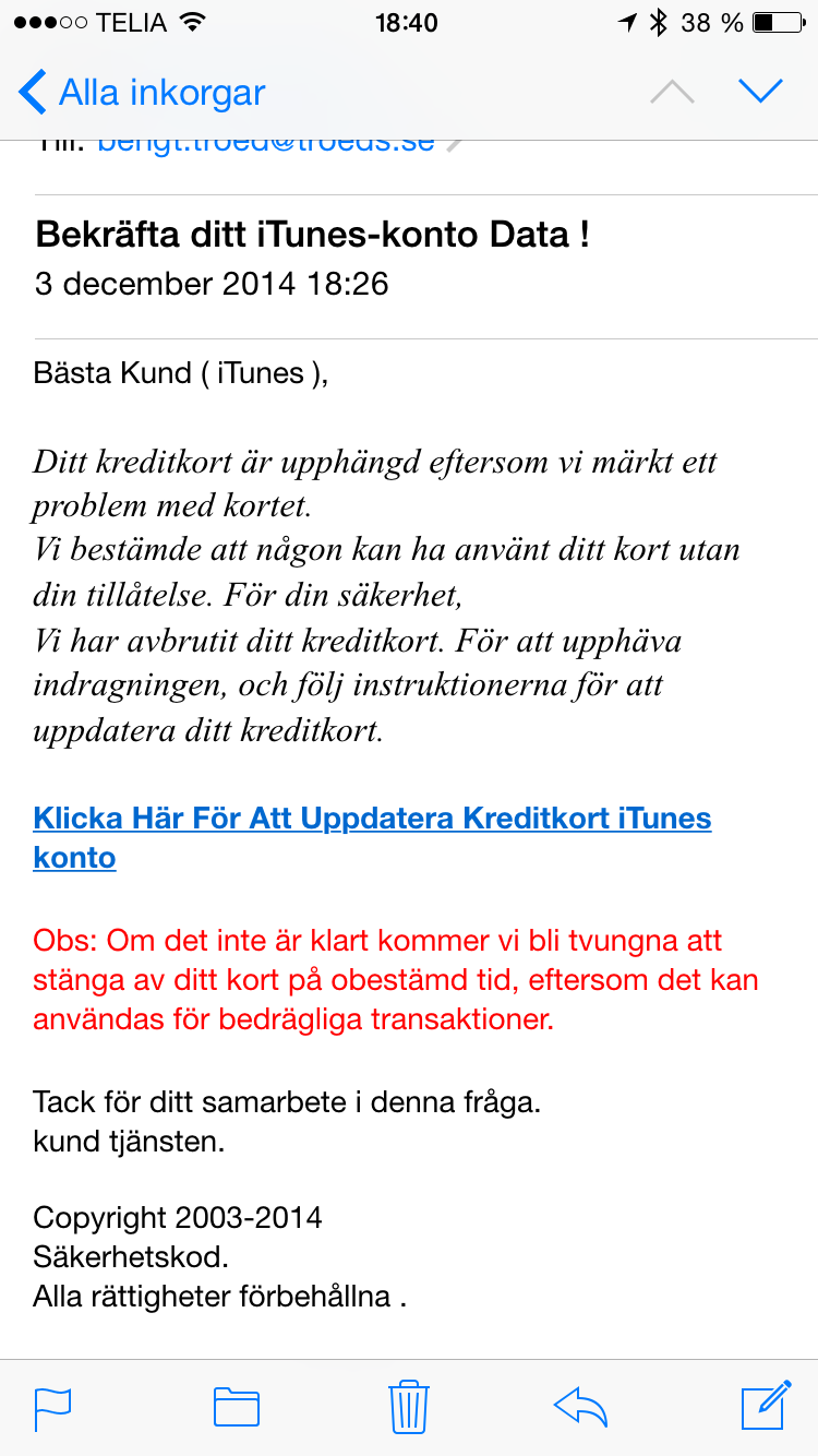 - Titta på avsändarens e-postadress! Kommer detta mailet verkligen från Apple eller nån partner?